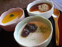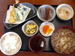 「工房ご膳」は、常陸秋蕎麦、天ぷら、味噌田楽、竹の子の煮物、カボチャの白和え。