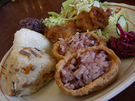 「おにぎりランチ」は、炊き込み、梅干、古代米のおにぎり&赤米いなり&揚げたて唐揚げ。