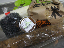 お目当ての「みずほちゃん玄米」、一緒に炊く豆、我家お気に入りのゆず味噌、