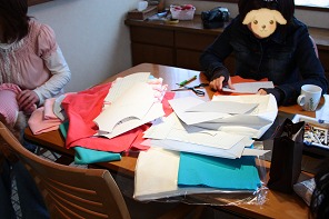 Pieも、抱えている宿題が終わったら、着物作りにチャレンジ。