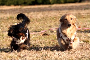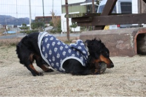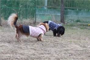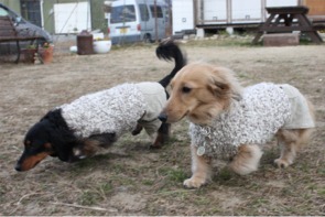 冷たい強風が吹く中、ココちゃんとタンゴ君が元気に追い駆けっこ。