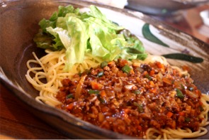 Pieは、鶏肉のピリ辛炒め&ライス、私は肉味噌パスタ(ジャージャー麺)&お惣菜。