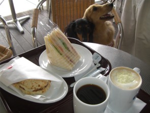 主食に予定していたイカ飯が食べられなかったので、何となくお腹が物足りず、テラス席ワンOKの「エクセルシオールカフェ」へ。
