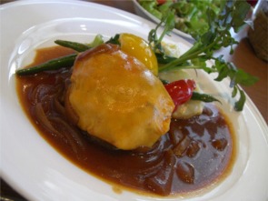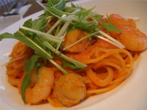 私がチーズハンバーグ、Pieが海老と帆立のトマトクリームパスタ。