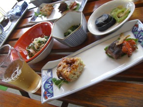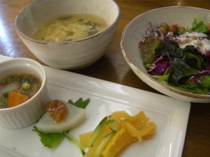サラダ、揚げ物、煮付け、漬物、酢物と盛り沢山。