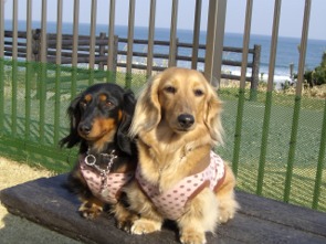 その前に、ドックランのベンチで、海をバックに記念撮影!