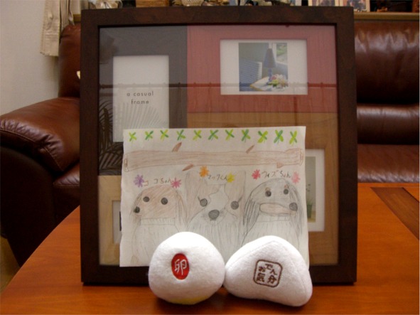 美乃ちゃんが描いてくれた3ワンの似顔絵&写真立て&coco&wizの玩具。