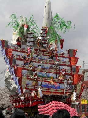 平和通りの中央には、高さ15m、重さ5tの「風流物」の山車が出て、各段でからくり人形が歴史物語を演じる。