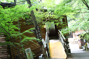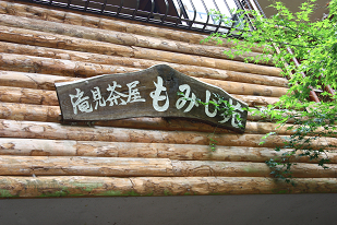 木陰の遊歩道を通り、滝の目の前にお店があります。
