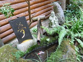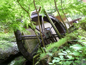 石臼用の大きな水車と和の置物などがさり気なく配置。