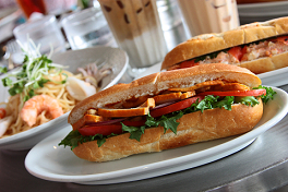 シーフードの明太子パスタ、スモークサーモン&クリームチーズのサンド、タンドリーチキンのサンド
