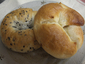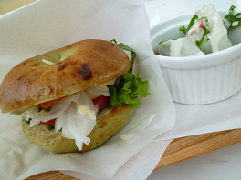 私が生パスタ、Pieはスモークサーモンのほうれん草ベーグル。