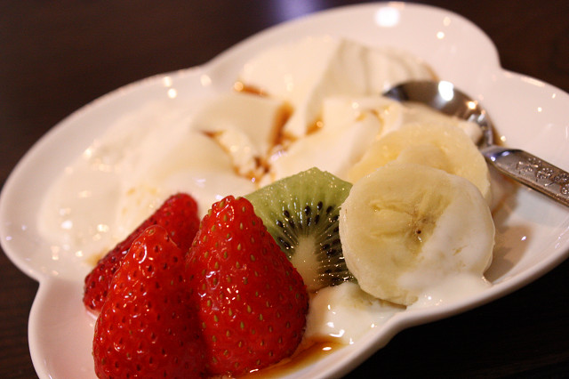 ホイップクリーム、シロップ、バナナ、苺を思い思いにトッピング。