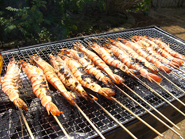 カットした牛ステーキ、鶏串、有頭海老、帆立、超長~いソーセージ、焼きおにぎり、焼き野菜、